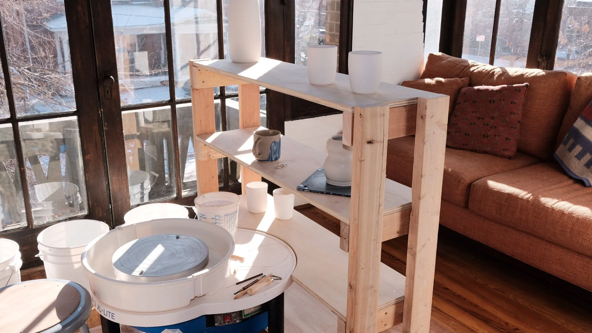 custom shelving unit built into the end of the wheel for easy pot transfers while throwing- shelves are removable